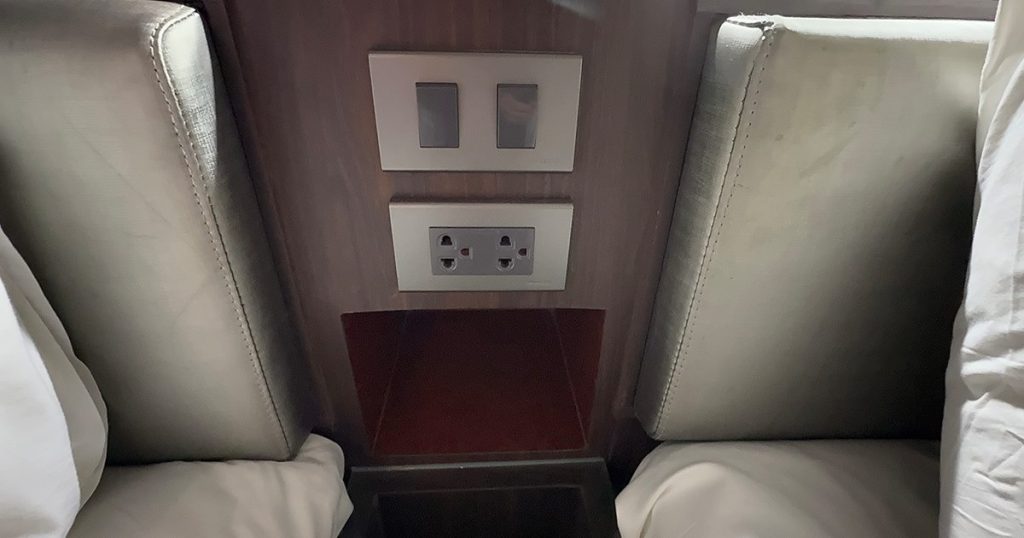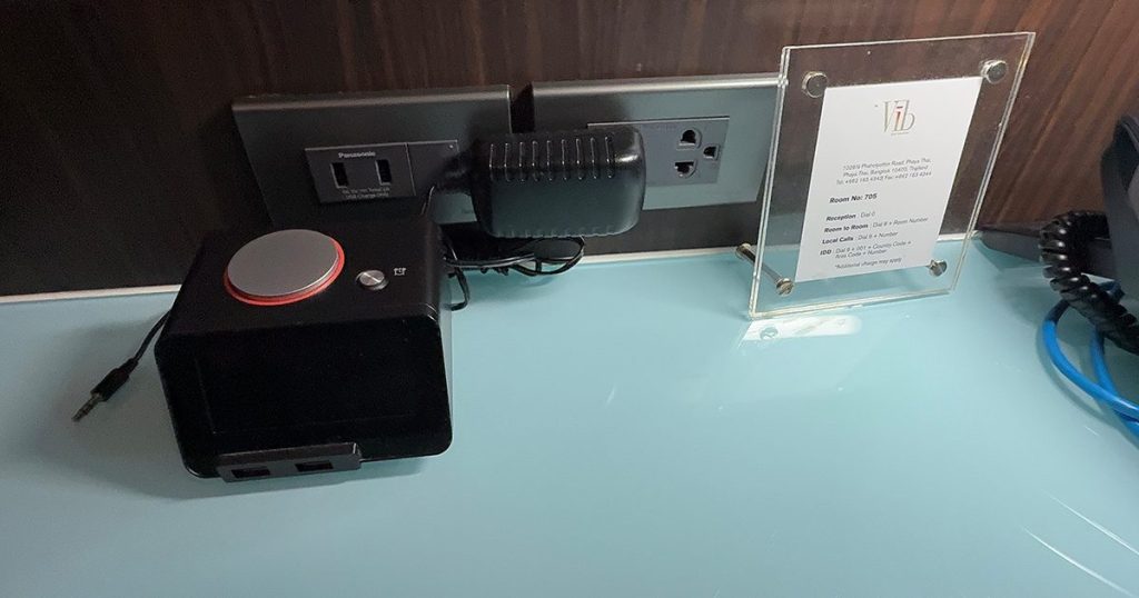 2つのベッドの間にはコンセントは国際プラグ対応のコンセントとライトのスイッチが用意されています。
