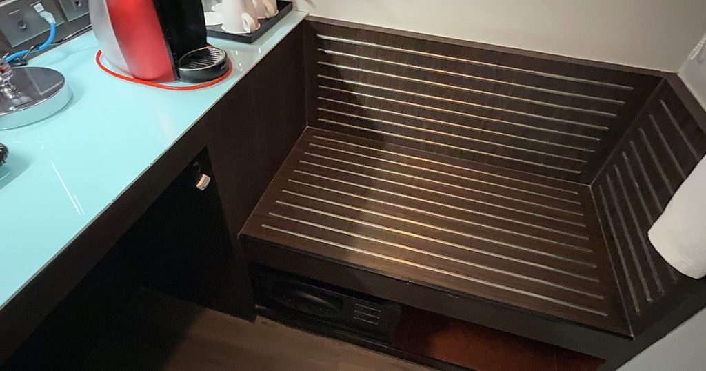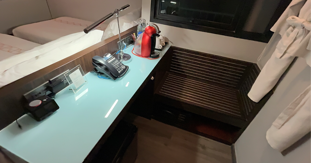 クローゼット機能も兼ねていますし、お茶セット、冷蔵庫とセーフティボックスもこちらのスペースにありますので、物に囲まれてしまいデスクとして使用する人は少ないかもしれません。