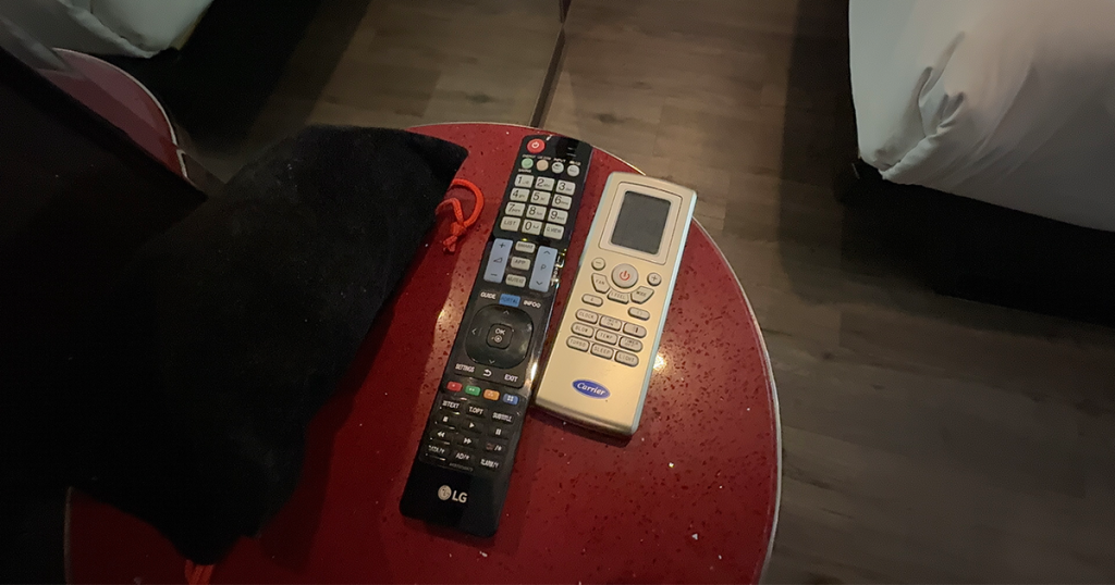 鏡の前にテレビ・エアコンのリモコンとドライヤーが置かれています。