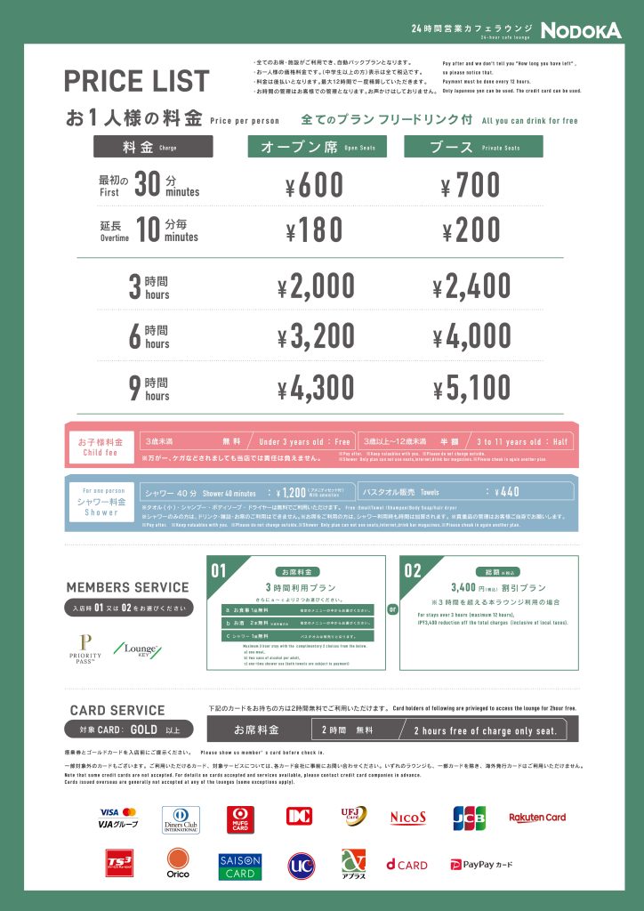 | サービス・カード | 3時間無料+食事1日品+酒2本+シャワー | 利用料3,400円割引 | 2時間無料 |
