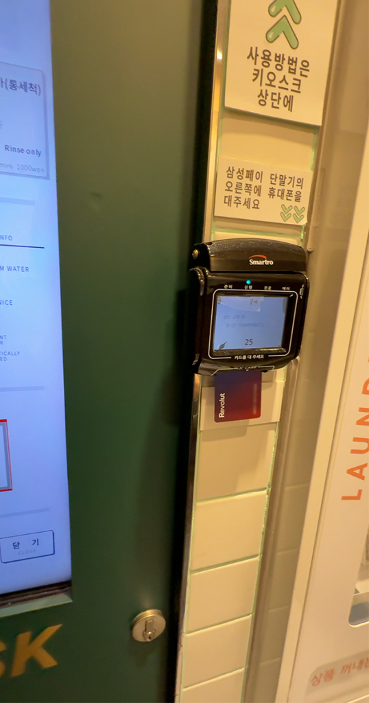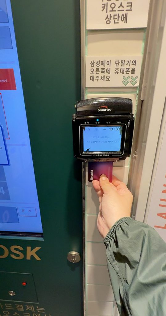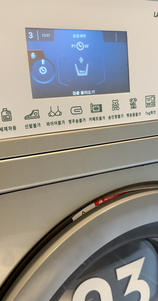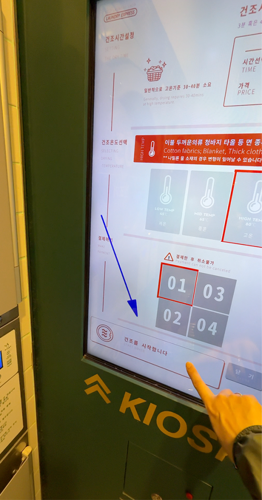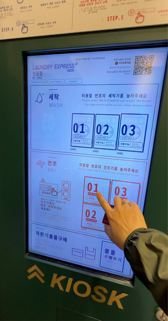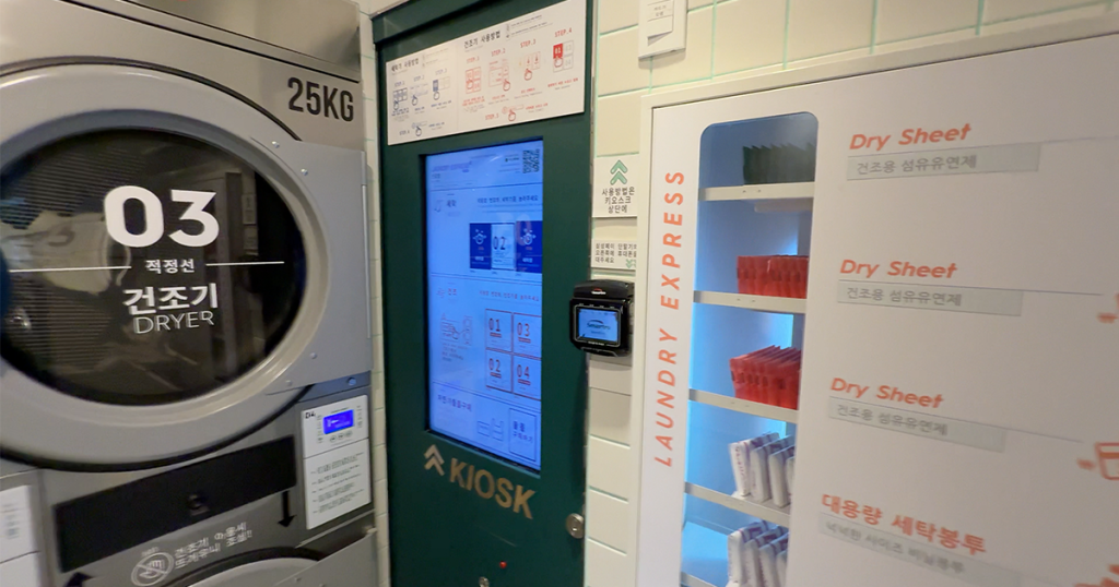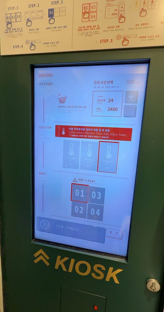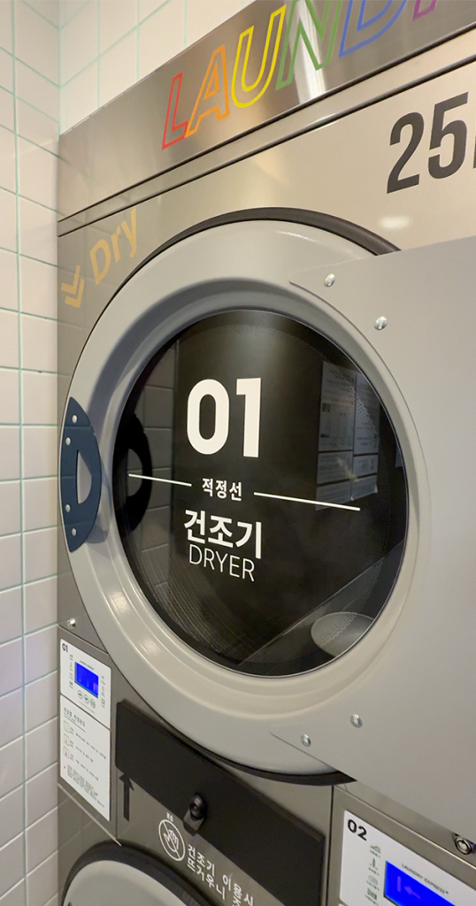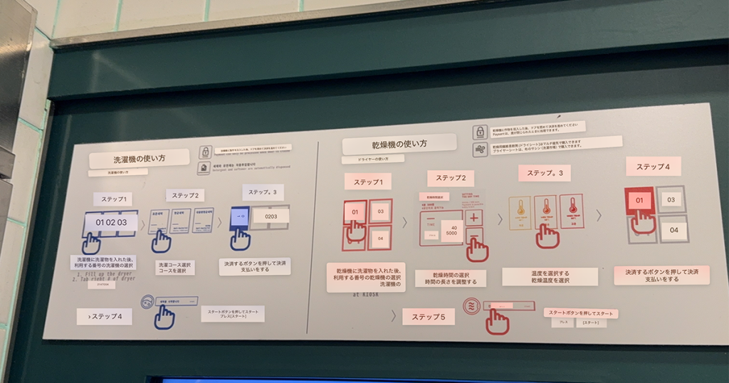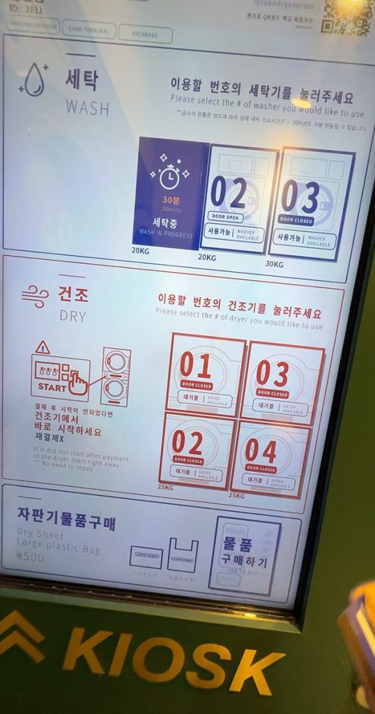 韓国語と英語表記だけですが、イラストでの説明もありますし、一般的なコインランドリーと使い方は大きく違わないので迷わないと思います。